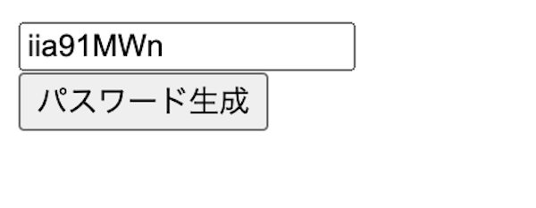 </html>ボタンをクリックするとinputタグの中にパスワードが生成されるように作っていきます。次にJavascriptでHTMLの要素を取得します。