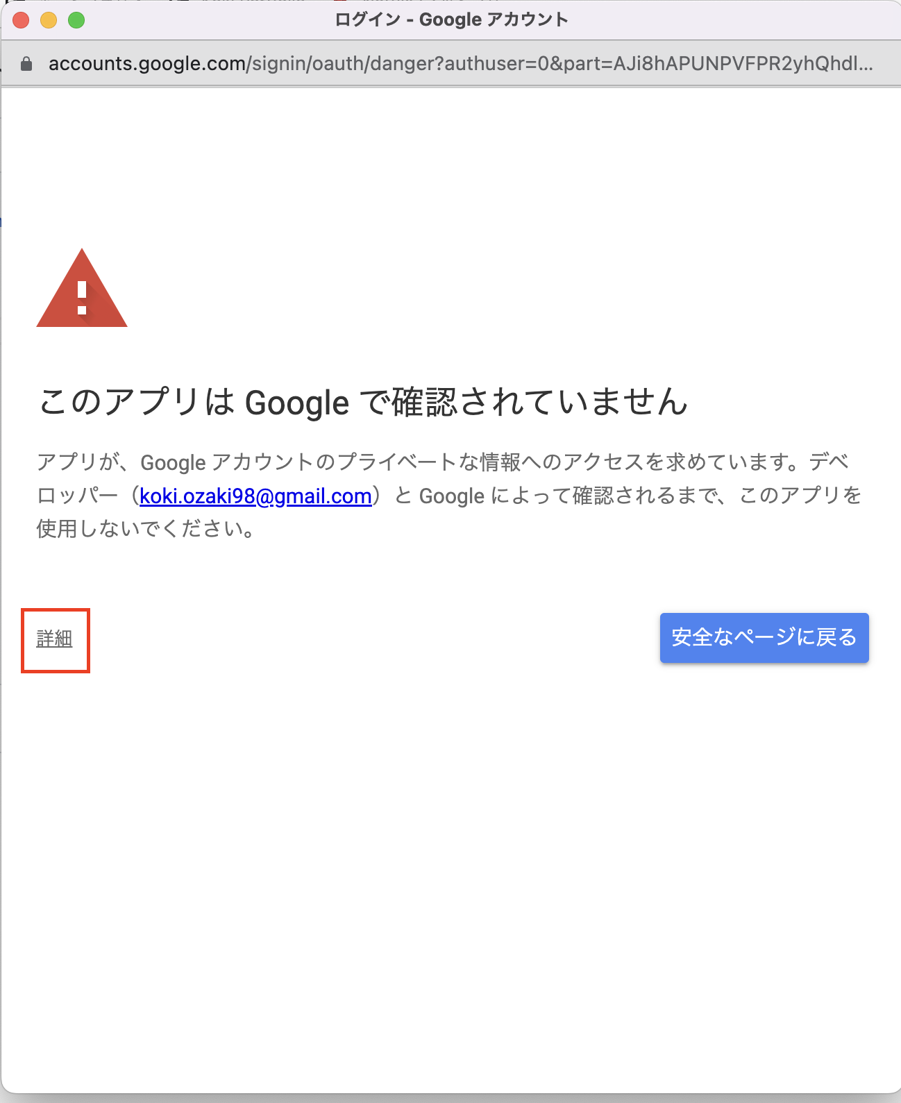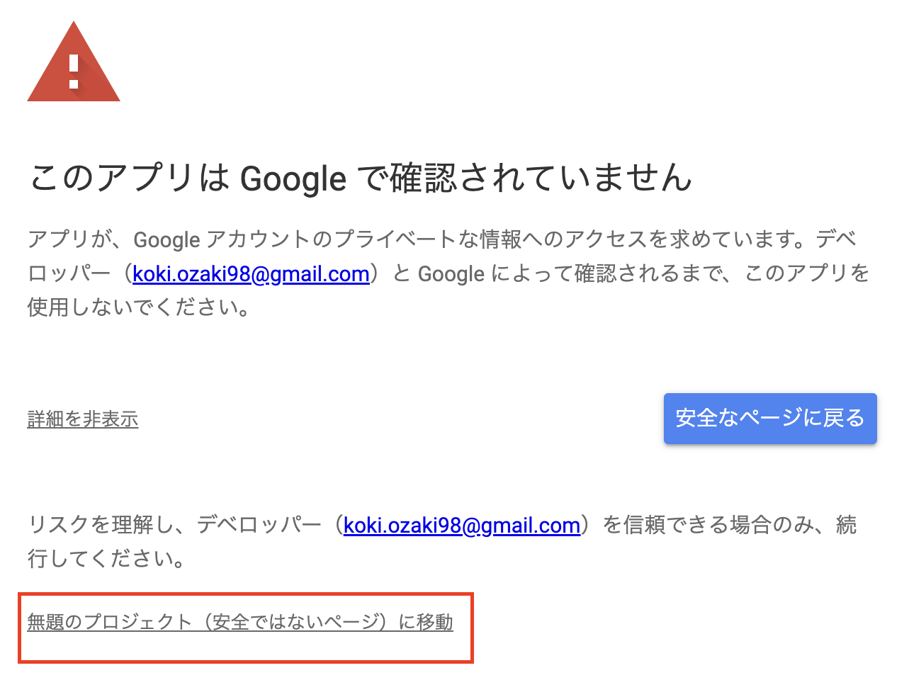 権限を確認をクリックし自分のGoogleアカウントを指定してください。