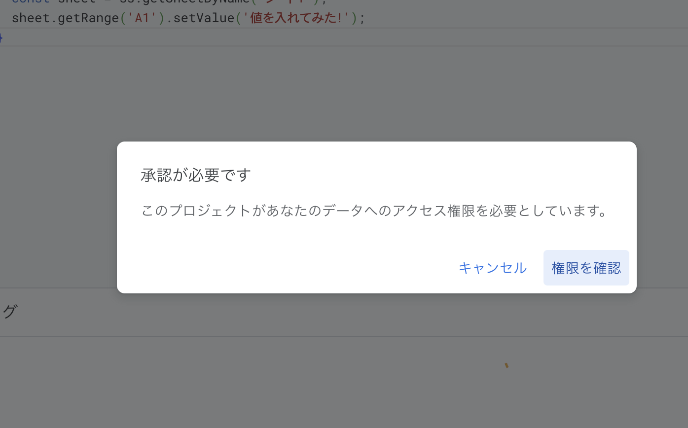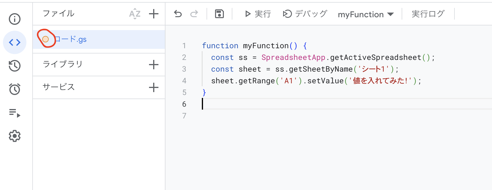 sheet.getRange('A1').setValue('値を入れてみた!');