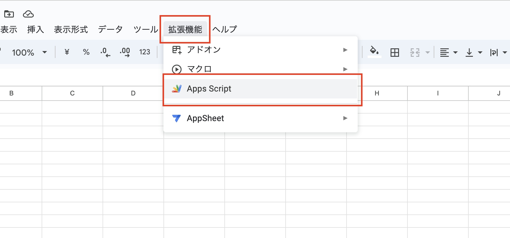 スプレットシートの拡張機能からApps Scriptを選択します。