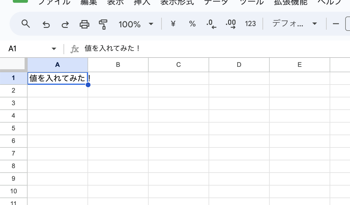 sheet.getRange('A1').setValue('値を入れてみた!');先ほどのコードに続いてsetValueメソッドを使うことで値を入力することができます。